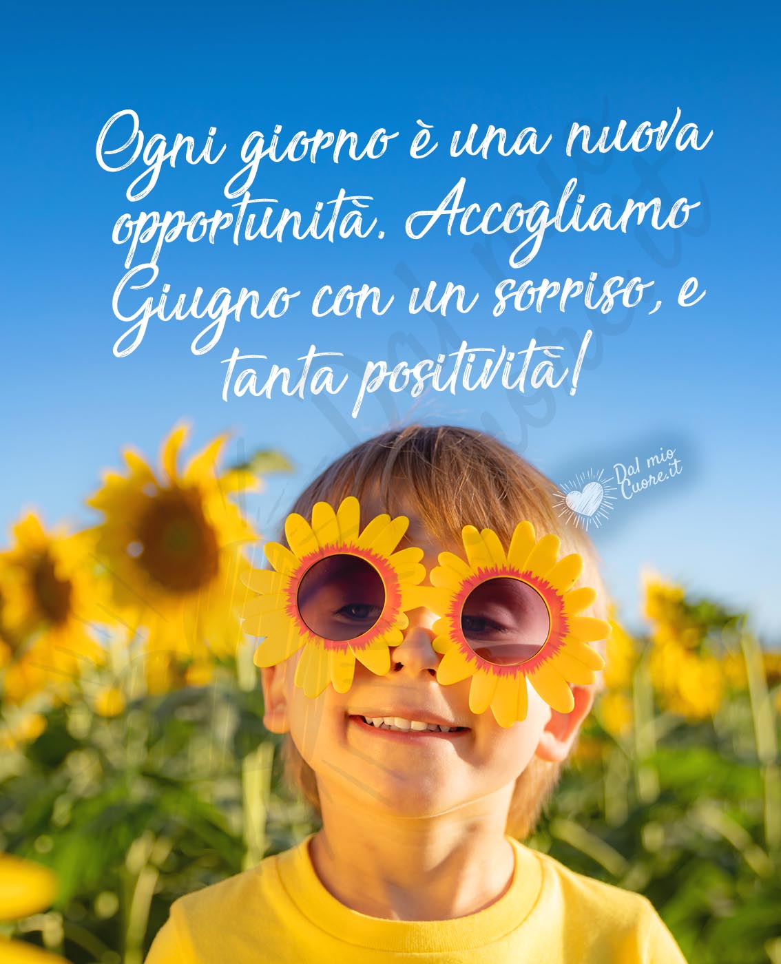 L'immagine di un bambino sorridente in un campo di girasoli trasmetterà la gioia necessaria per accogliere il mese di giugno a braccia aperte e con positività. Condividila su Whatsapp e Instagram.