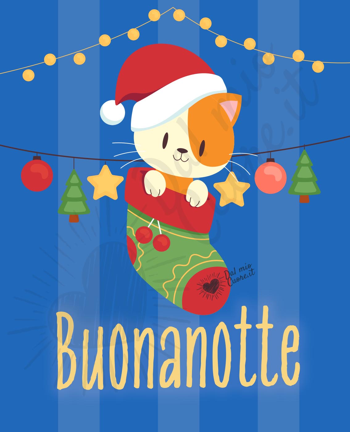 Un dolce gattino con il cappello di Babbo Natale sbuca da una calza colorata, circondato da lucine e piccole decorazioni natalizie.. Una buonanotte speciale che avvolge di calore e magia il cuore di chi la riceve.