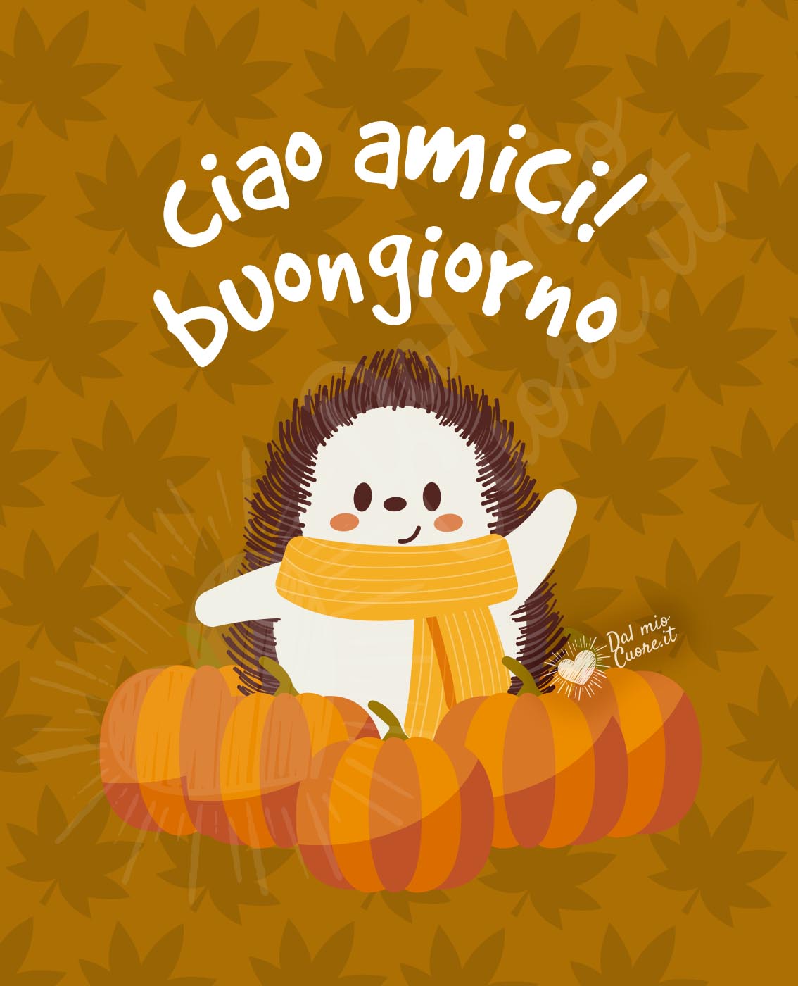 Un buongiorno d'autunno che profuma di zucche. I colori dorati delle foglie e un simpatico riccio che saluta rendono unica e speciale questa immagine. Condividila con chi ami