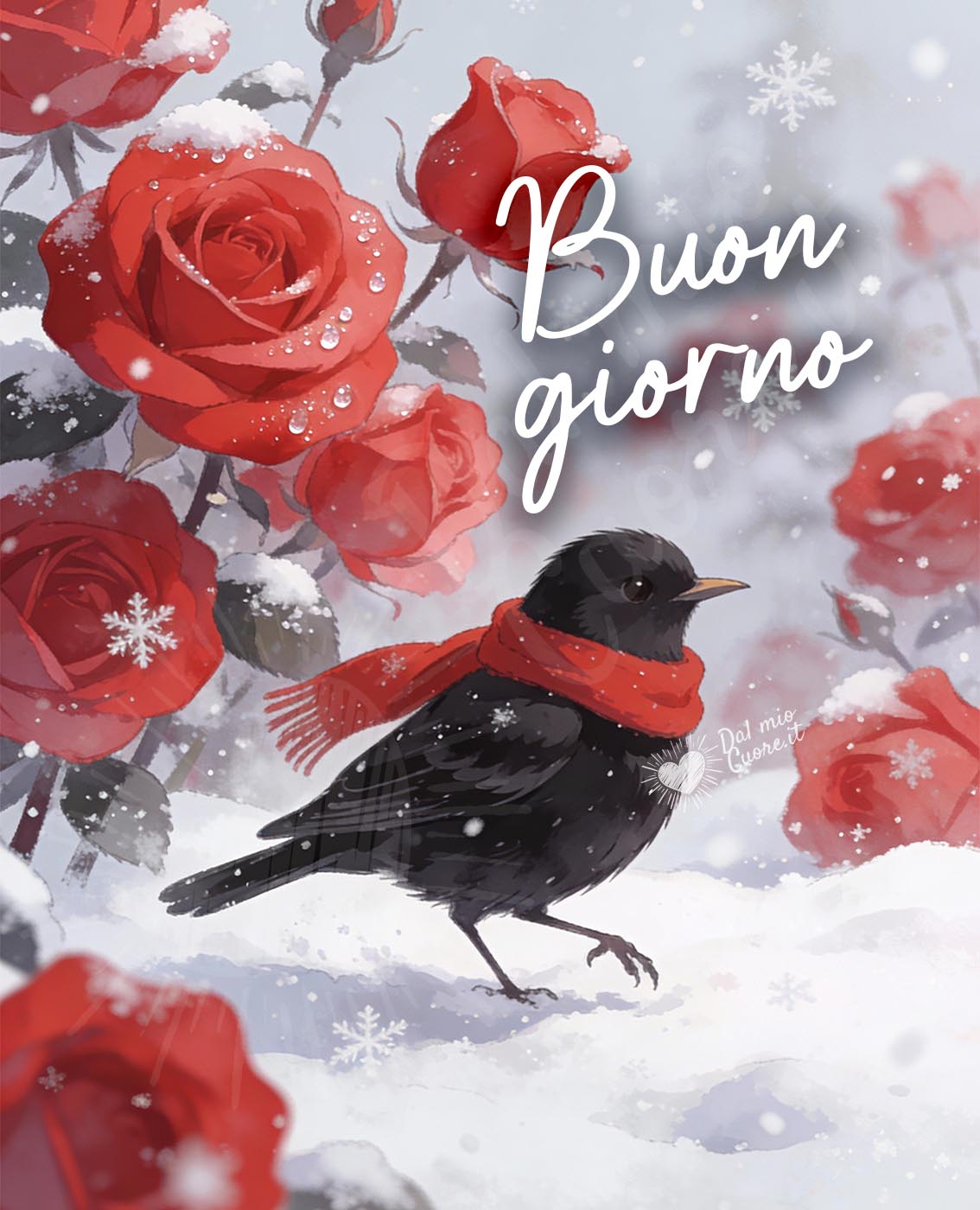Buongiorno invernale con uccellini sotto la neve