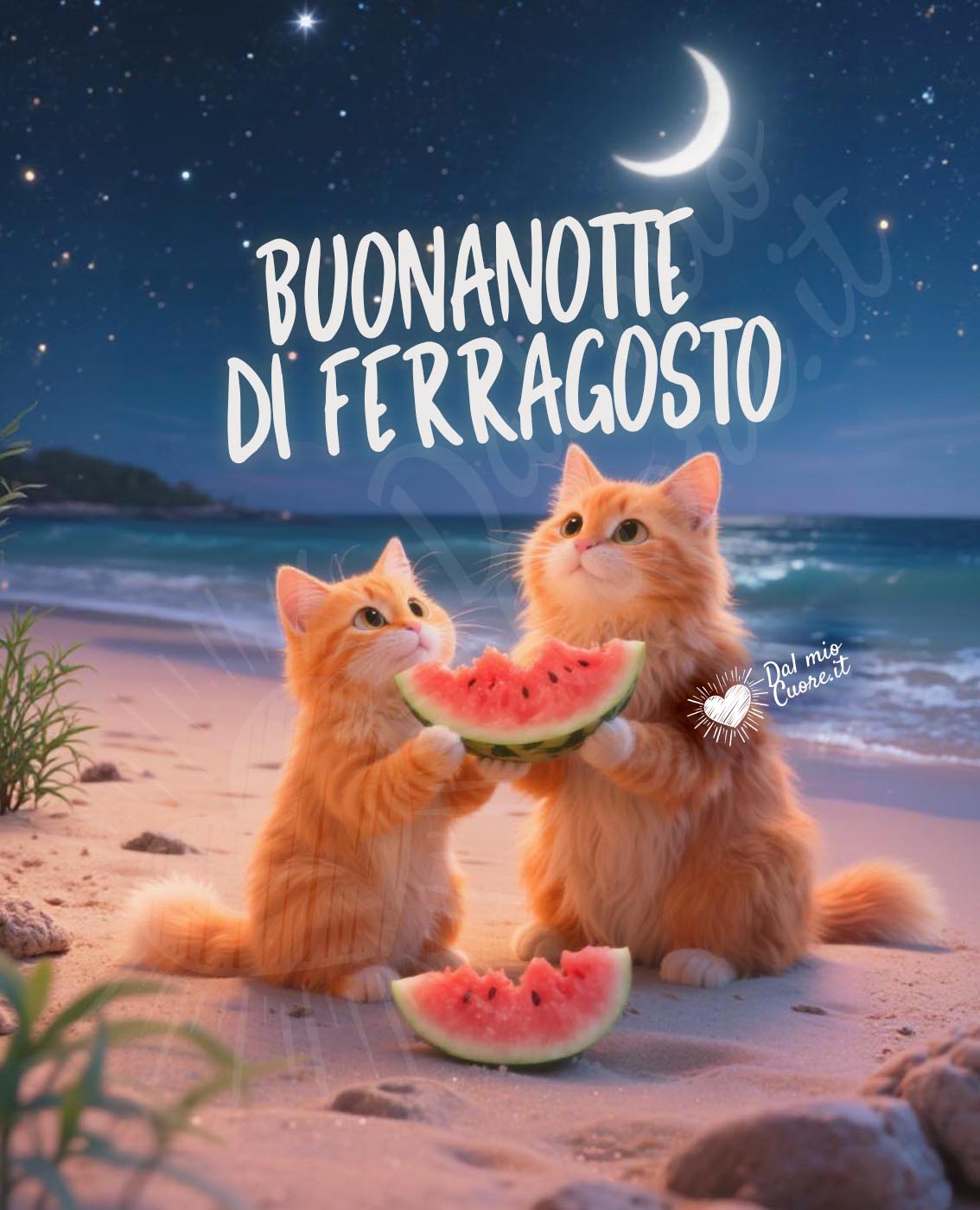 Due gattini e una dolce fetta d’anguria per augurarti una notte serena di Ferragosto. Condividi questa tenerezza estiva con chi vuoi coccolare con un pensiero